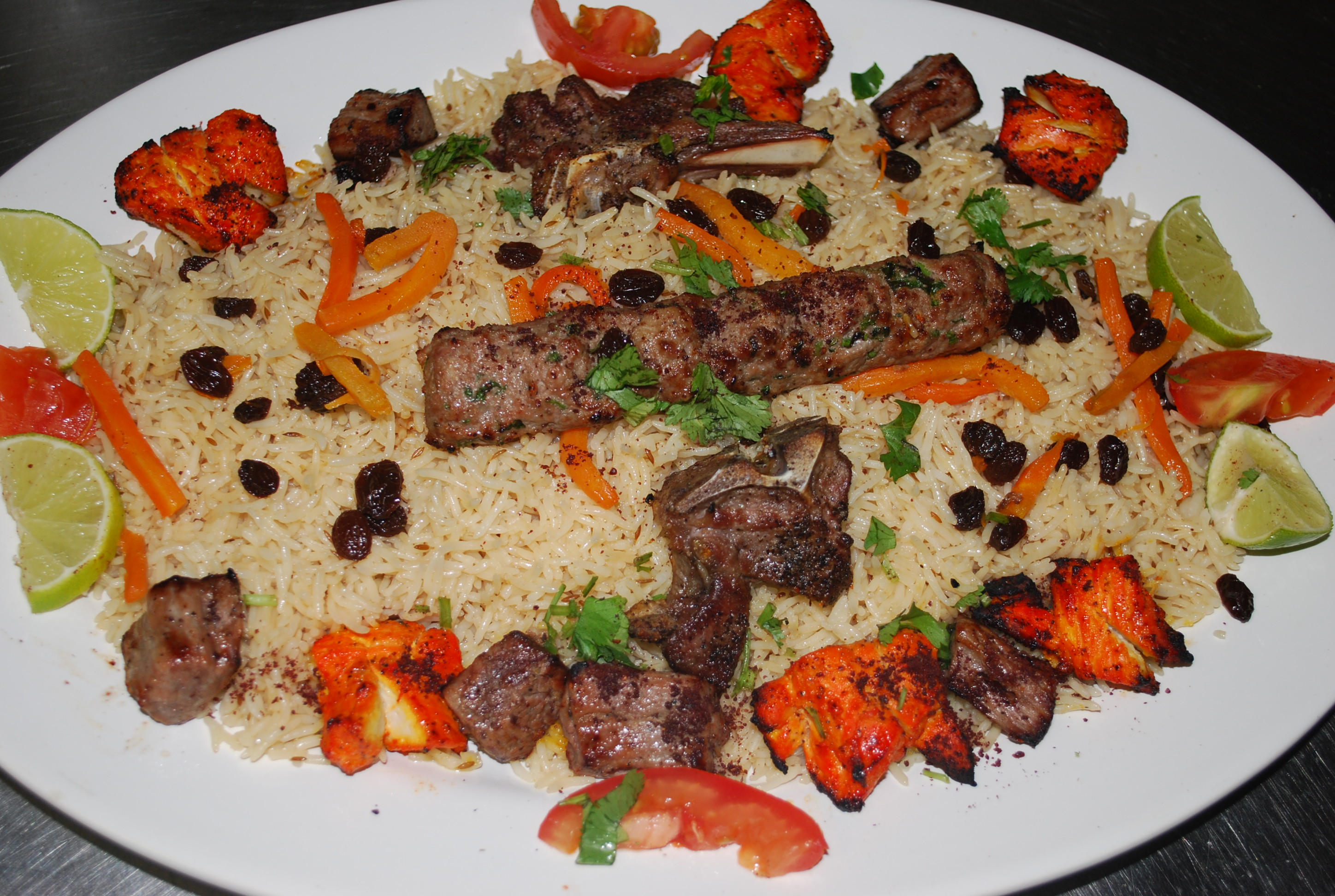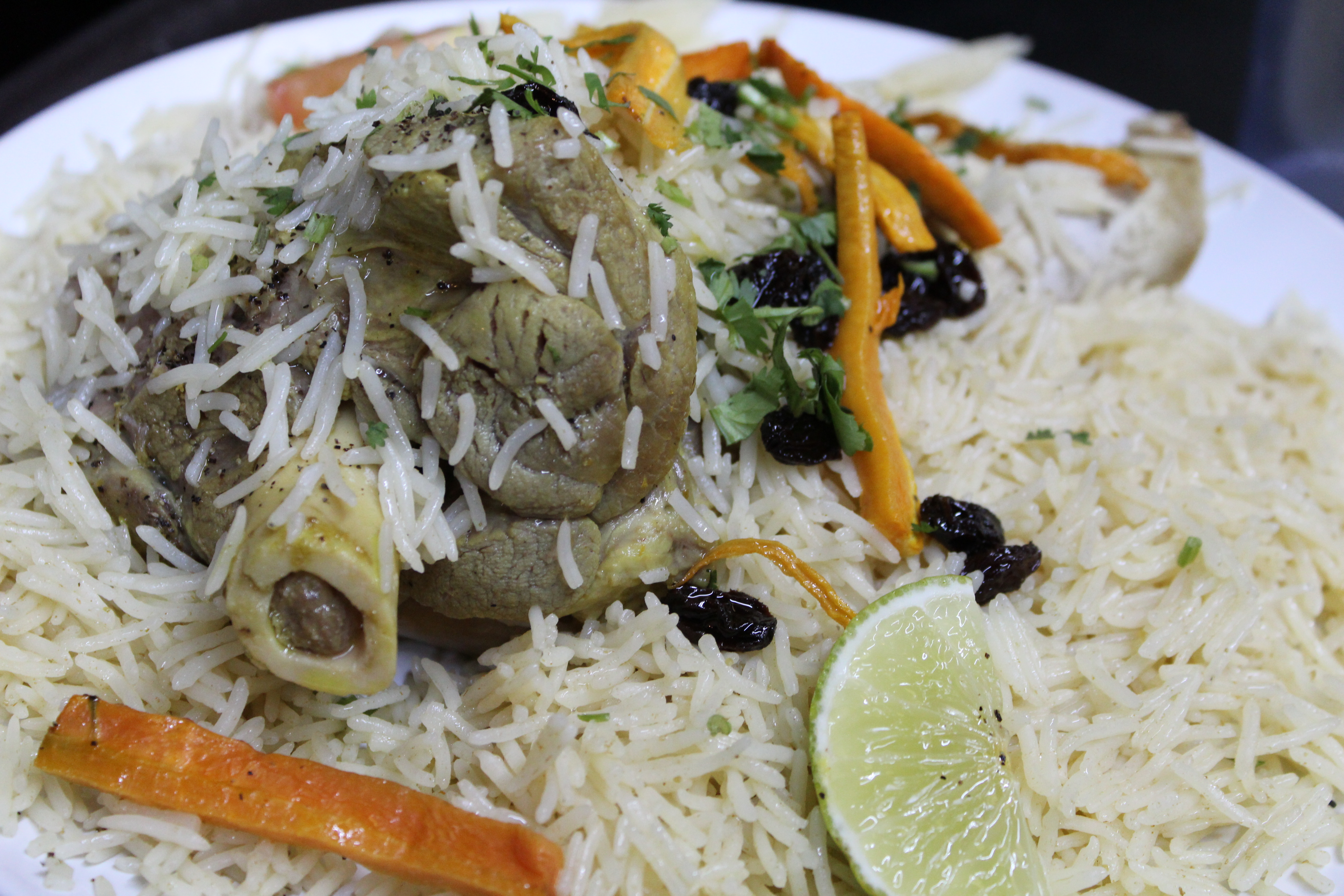 Seasoned rice with tender chunks of lamb under a heaping sweet carrot strips and raisins.