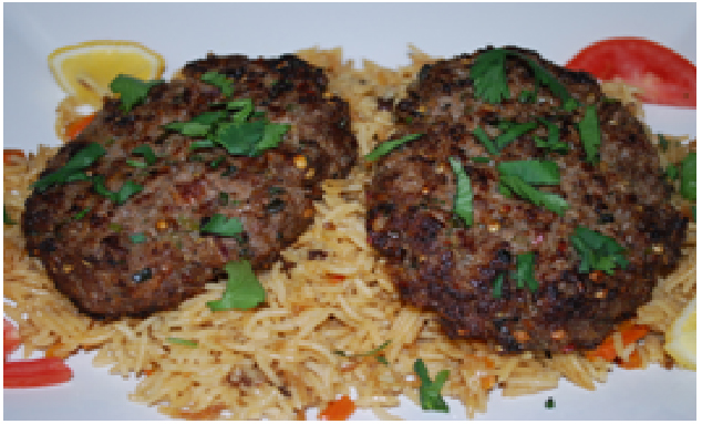 Beef patties mixed with onion, leek and other Afghan seasonings, grilled until cooked thoroughly.