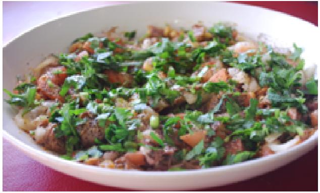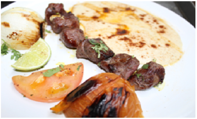 Grilled/Chunks ground beef kabob marinated and cooked on the grill, then cooked with tomatoes and Afghan spices served with naan