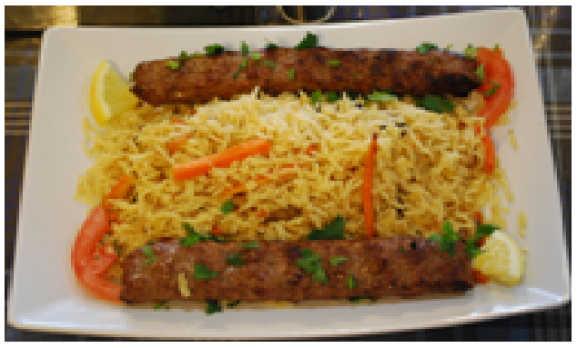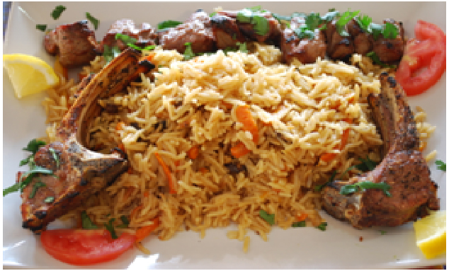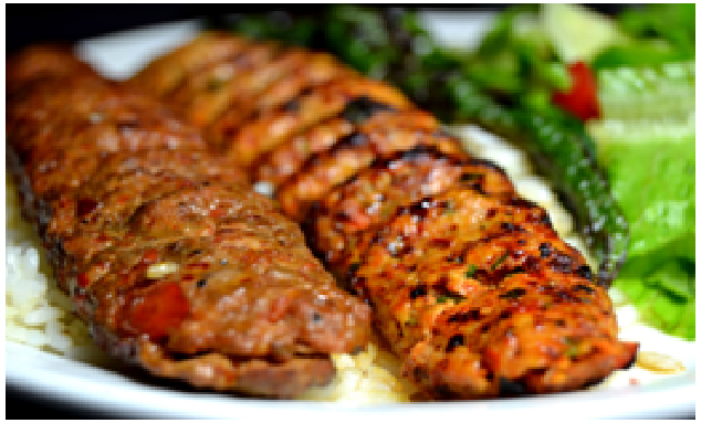 Seasoned ground beefbroiled on a skewer served with rice or naan & hummus