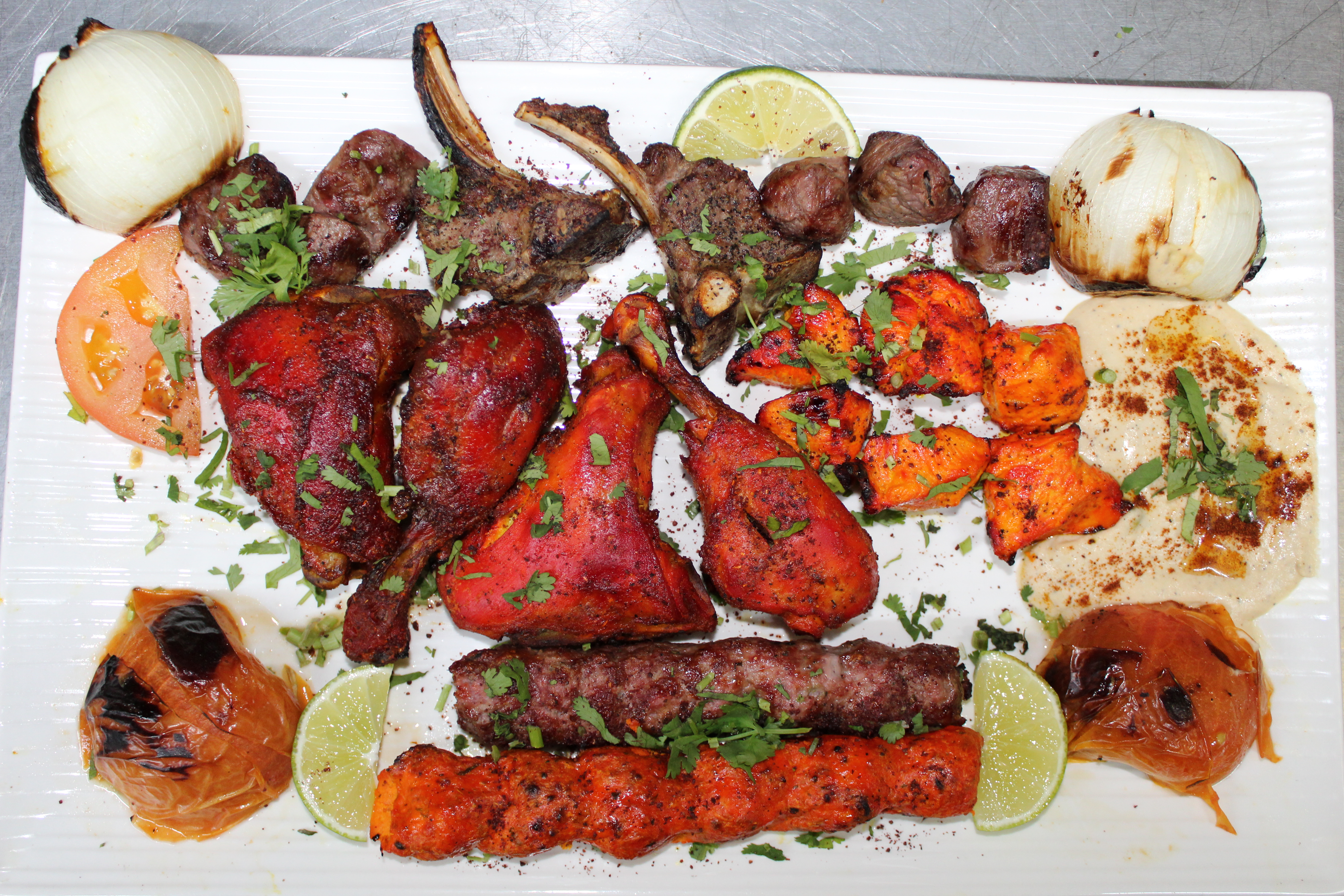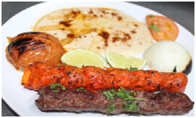Grilled ground / chunks of chicken kabob marinated and cooked on the grill, cooked with tomatoes served with naan.