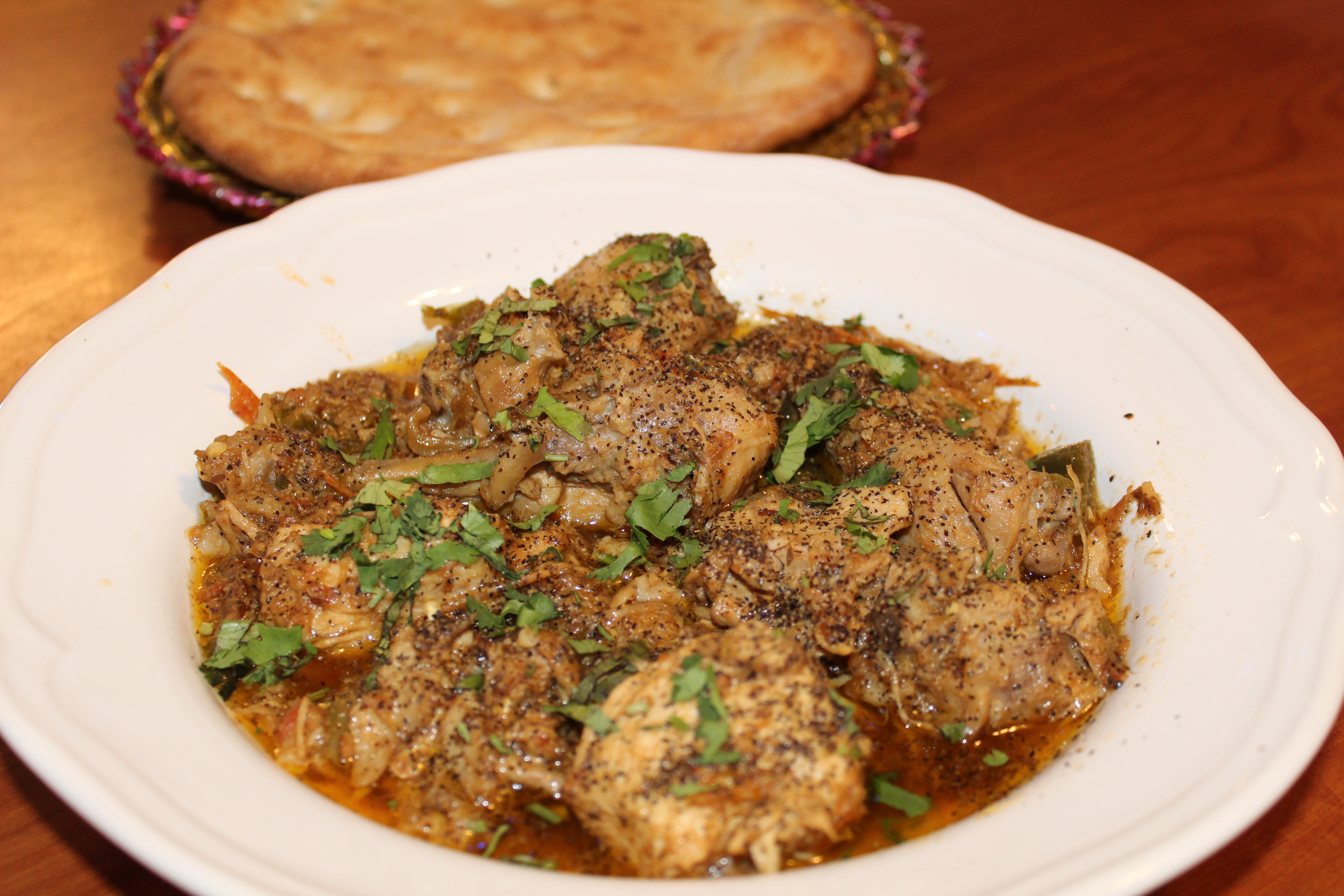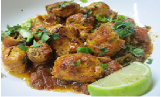 Chicken sauteed with fresh tomatoes, spices, ginger and garlic served with fresh Naan