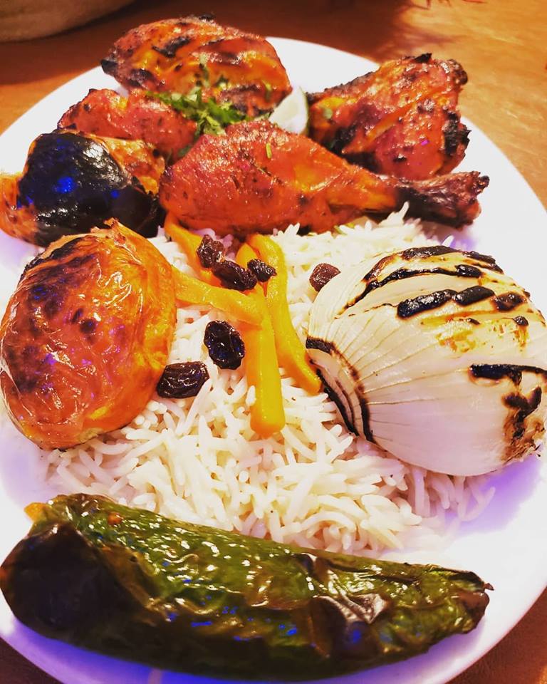 Grilled chicken legs and thighs served with rice or naan & hummus