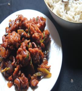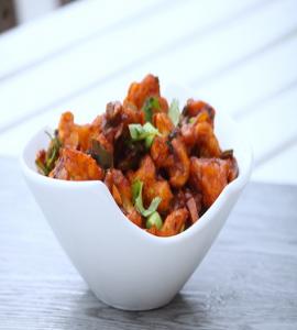 Cauliflower pieces marinated in corn batter spices, deep fried & tossed with spices & sweet soy sauce