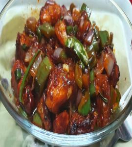 Boneless cubes of chicken marinated in corn flour batter spices, deep fried and tossed with chilli sauce and spices