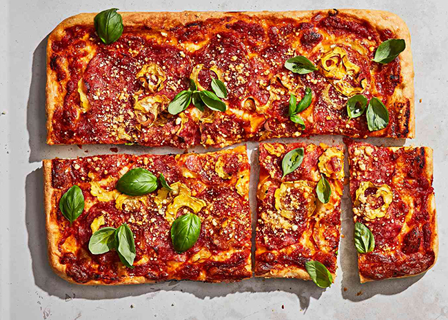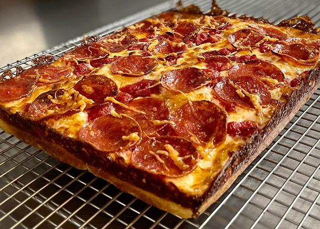 A Detroit pizza features a thick crust that is chewy and crispy. It is generally rectangular and features smaller portions of pepperoni that curl up.
