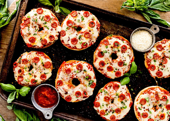 A bagel pizza is generally a bagel baked with pizza toppings. They look like small pizzas that are ideal for lunch, snacks, or even dinner.