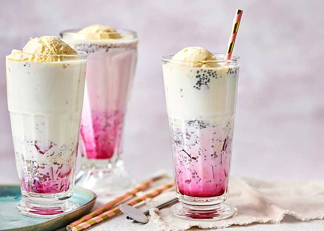 Falooda is a popular ice cream dessert made with vermicelli, jelly, rose syrup, sabja seeds, milk and ice cream.