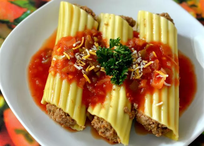This large tube-shaped pasta is usually filled with cheese or meat filling and baked. The surface of the pasta can be either smooth or ridged.